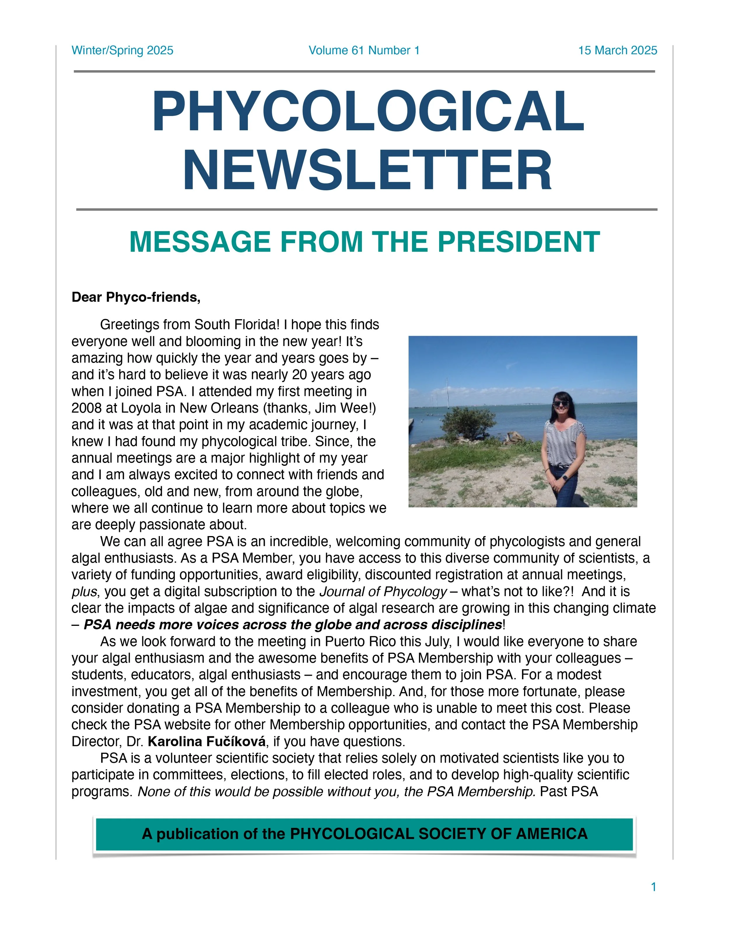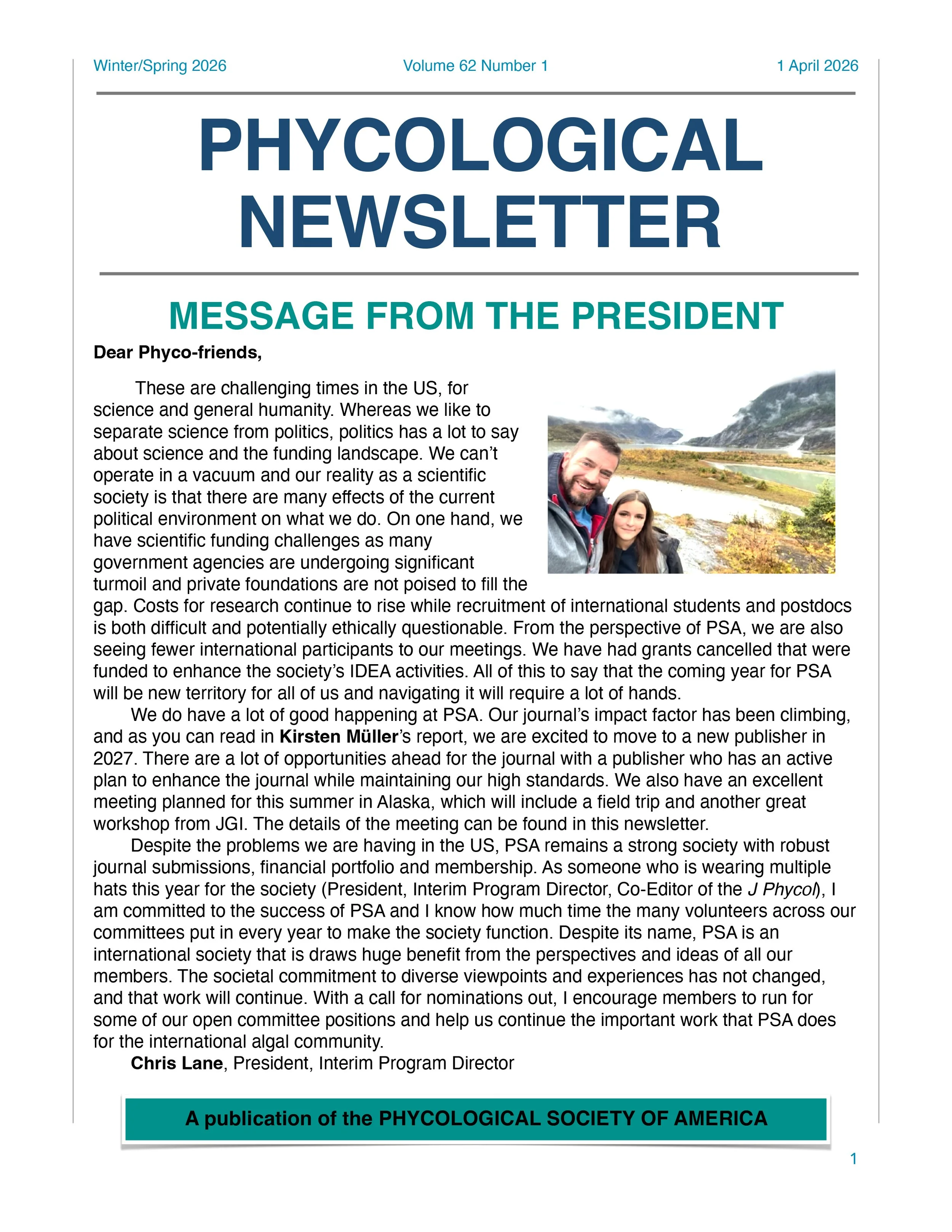The Phycological Newsletter, a publication of PSA, contains news of Society activities, news of colleagues, book review, information on summer field courses and graduate programs, and general articles of interest to phycologists. For more information or to submit contributions, please contact our current Communications Director. Contributors are welcome to submit phycological news items, announcements of books, courses, awards, articles, and other items for publication in the newsletter.